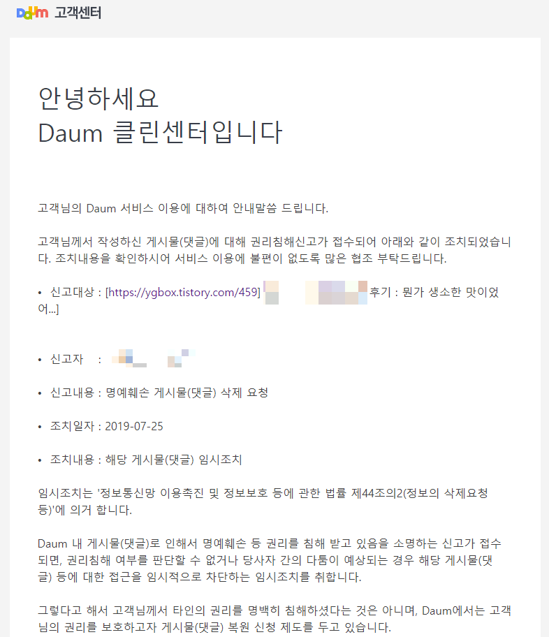 내 글의 어떤 내용 때문에 글을 명예훼손으로 신고한 건지는 모르겠지만,