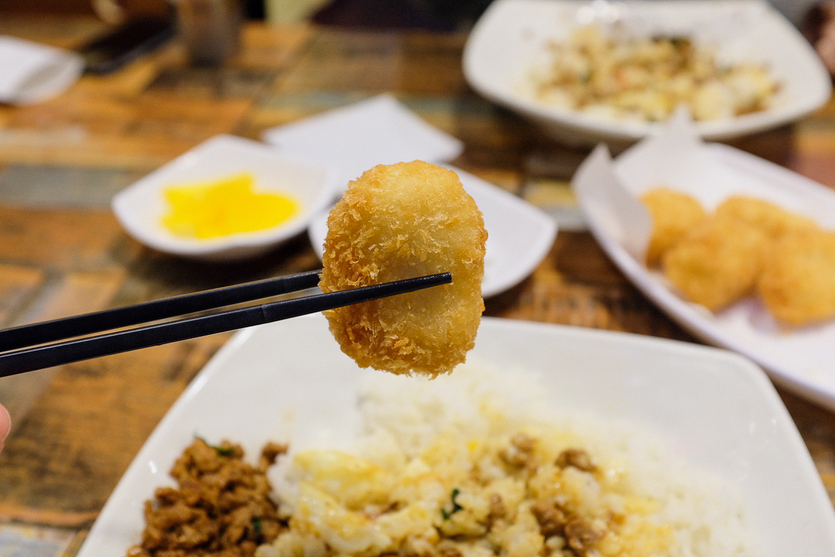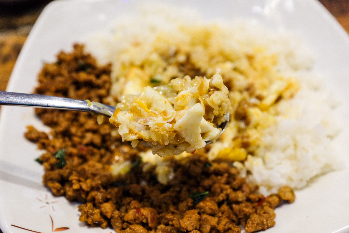 달걀 반숙이 밥과 돼지고기 볶음 사이에서 균형을 맞춰주고 있네요.