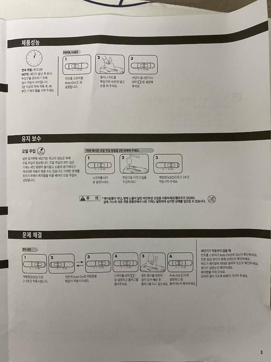 한 번에 6장 세단, 정기적으로 오일을 사용해서 관리해줘야 합니다.