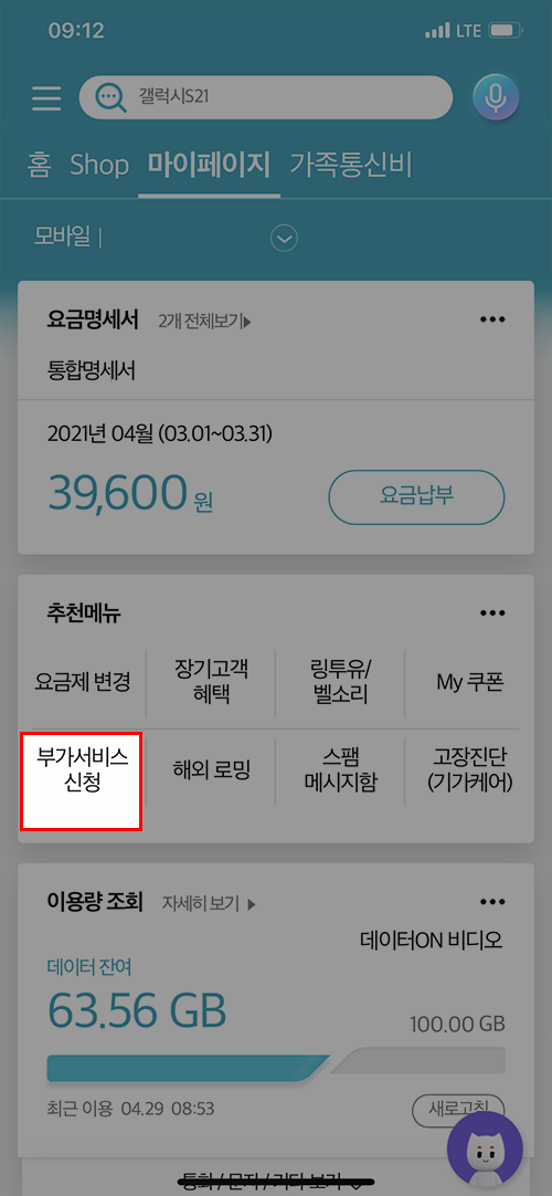 마이 페이지로 이동하여 [부가서비스 신청]을 누른다.