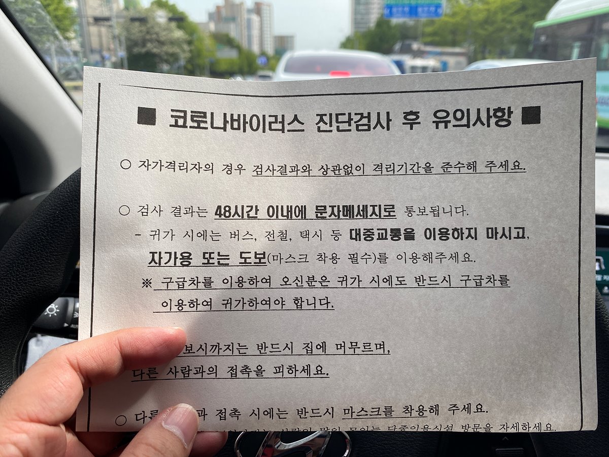 코로나19 진단 검사 후 유의사항이 적힌 유인물을 받았다.