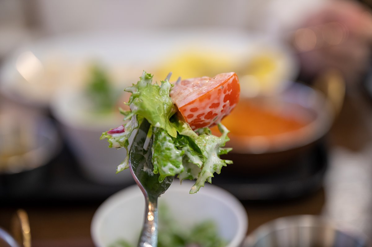 커다란 토마토와 함께 푸른 채소로 구성되어 있고, 신기하게 병아리 콩이 들어 있었다.