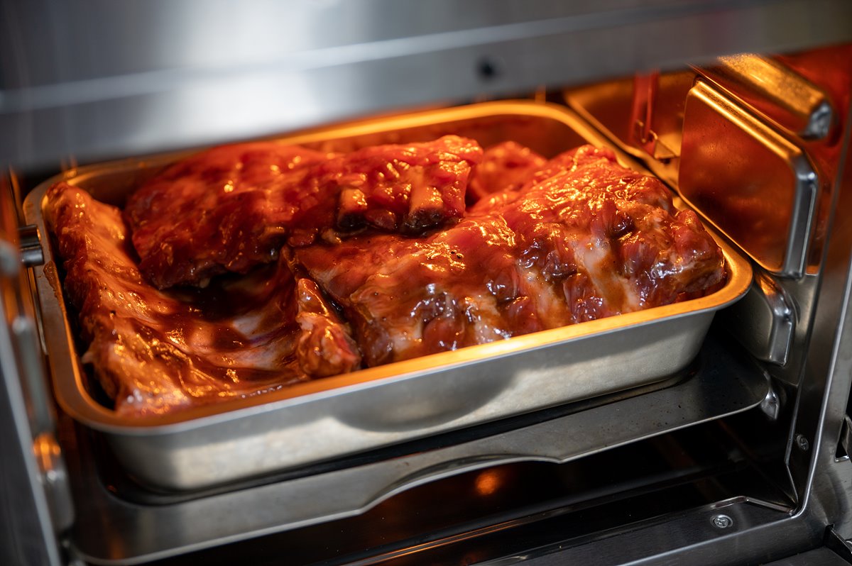 4. 폭립에 사과주스를 바른 다음 뒤집어 170도로 10분 조리한다.
